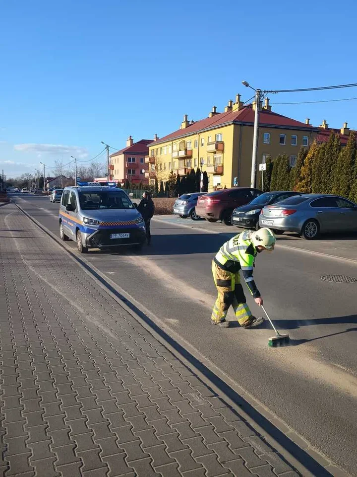 Na ul. Kawiary w Gnieźnie rozlana substancja ropopochodna mogła szybko zamienić jezdnię w niebezpieczny odcinek. Zamiast chaosu pojawiło się jednak działanie – młody ochotnik z OSP Kawiary od razu sięgnął po sorbent, a patrol Straży Miejskiej zabezpieczał ruch i sprawdzał, skąd wziął się problem. Tego dnia liczyła się szybka reakcja i współpraca.